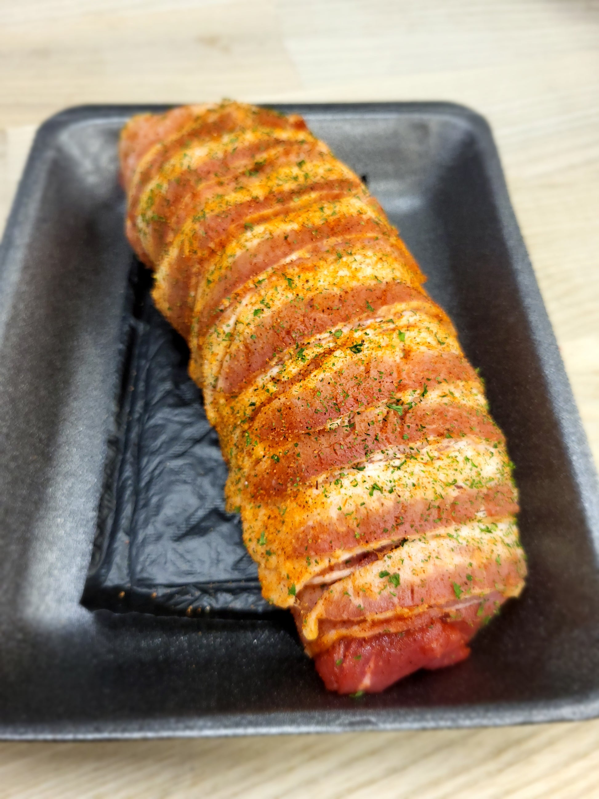 This is a Pork Tenderloin stuffed with our jalapeno cream cheese and boudin mixture seasoned and wrapped in bacon. Perfect for the oven, air fryer or grill.