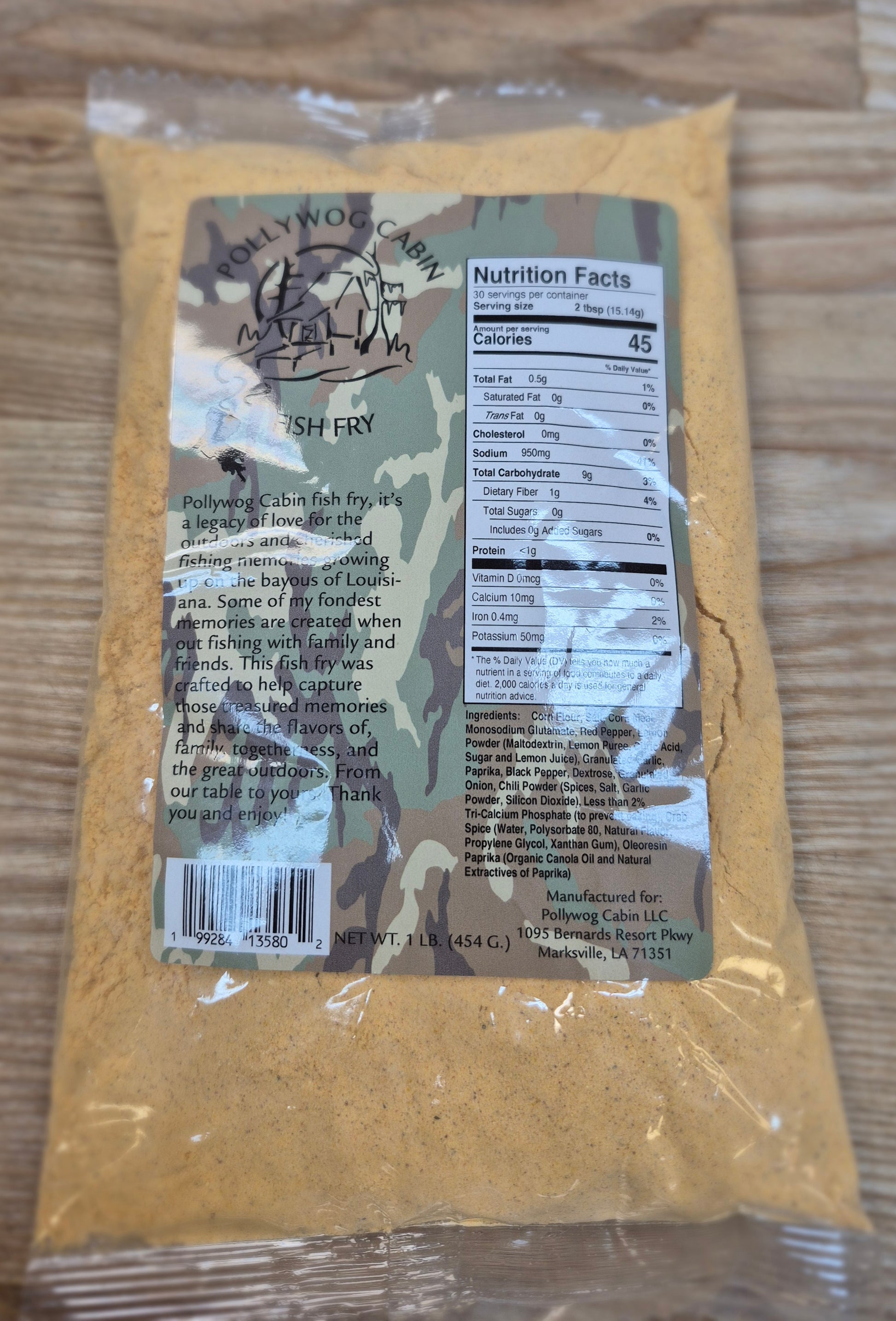 Pollywog Cabin Fish Fry Comes 1 lb. package. True Louisiana seasoning at its finest in our opinion.