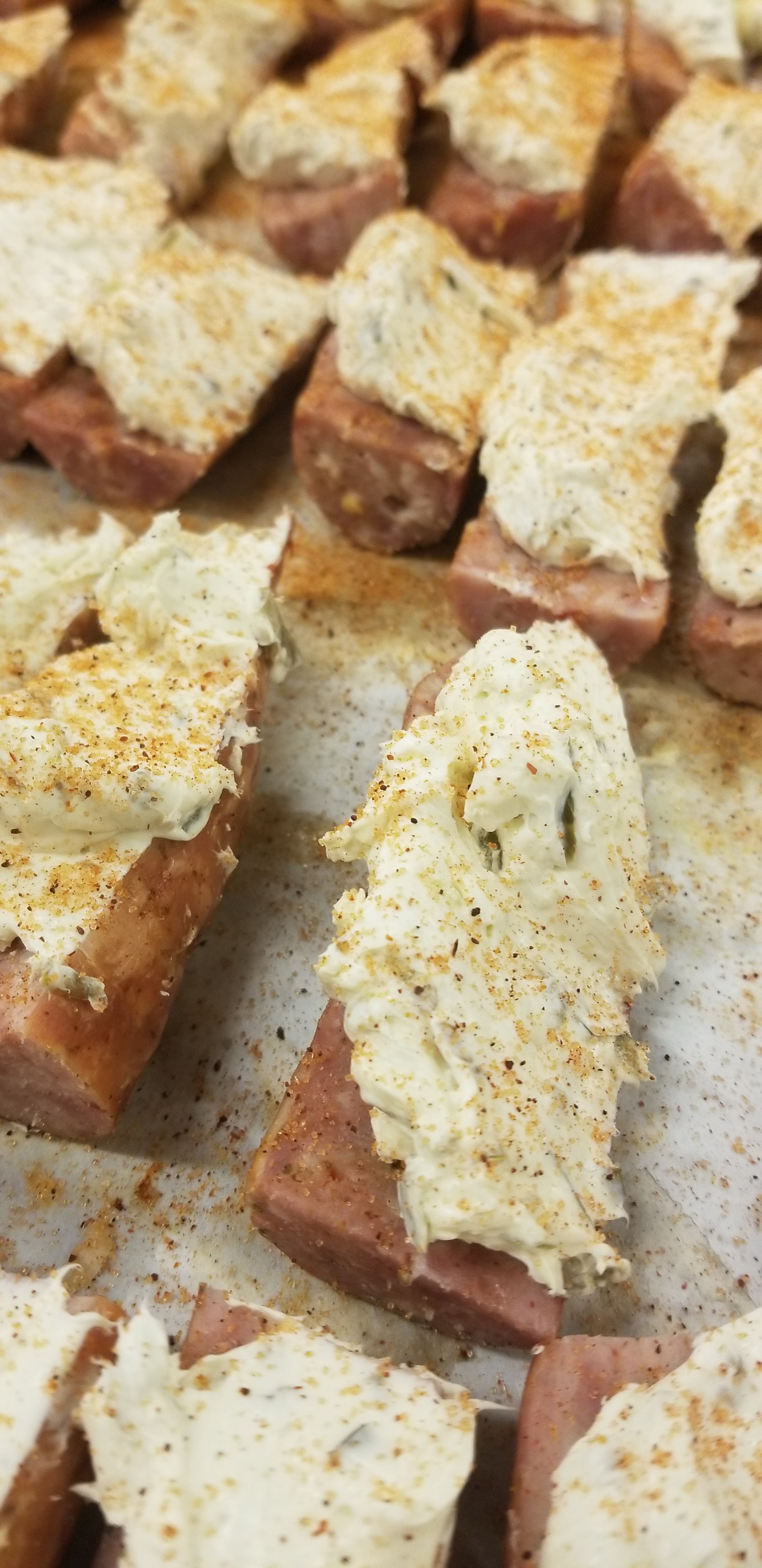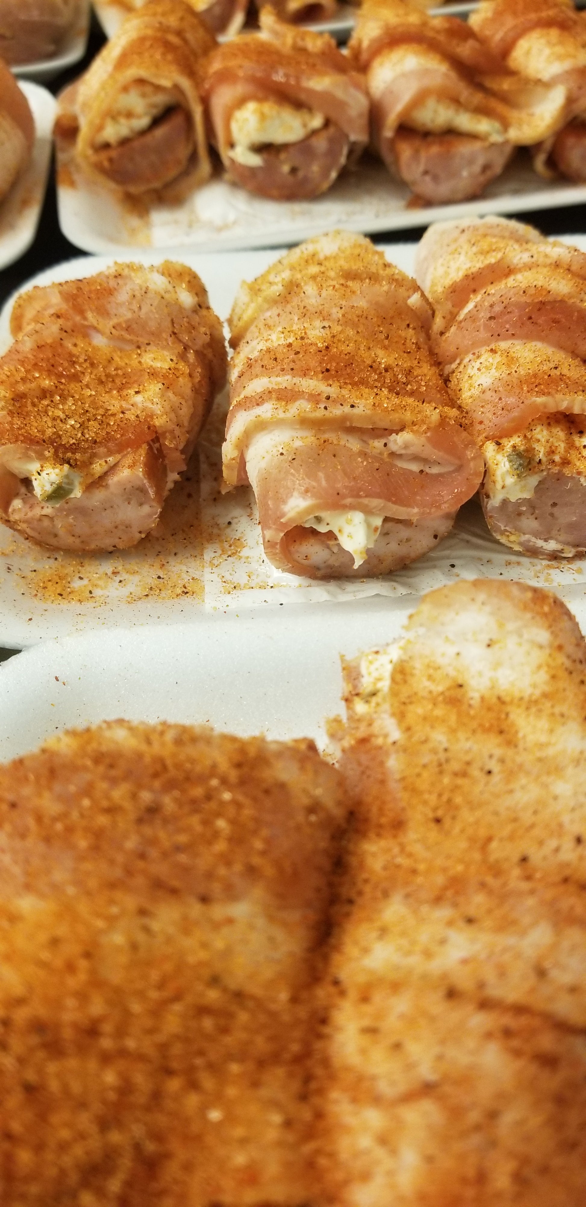 Our smoked sausage is halved and topped with a blend of jalapeno cream cheese before being wrapped in bacon. It makes for a perfect appetizer at any gathering.