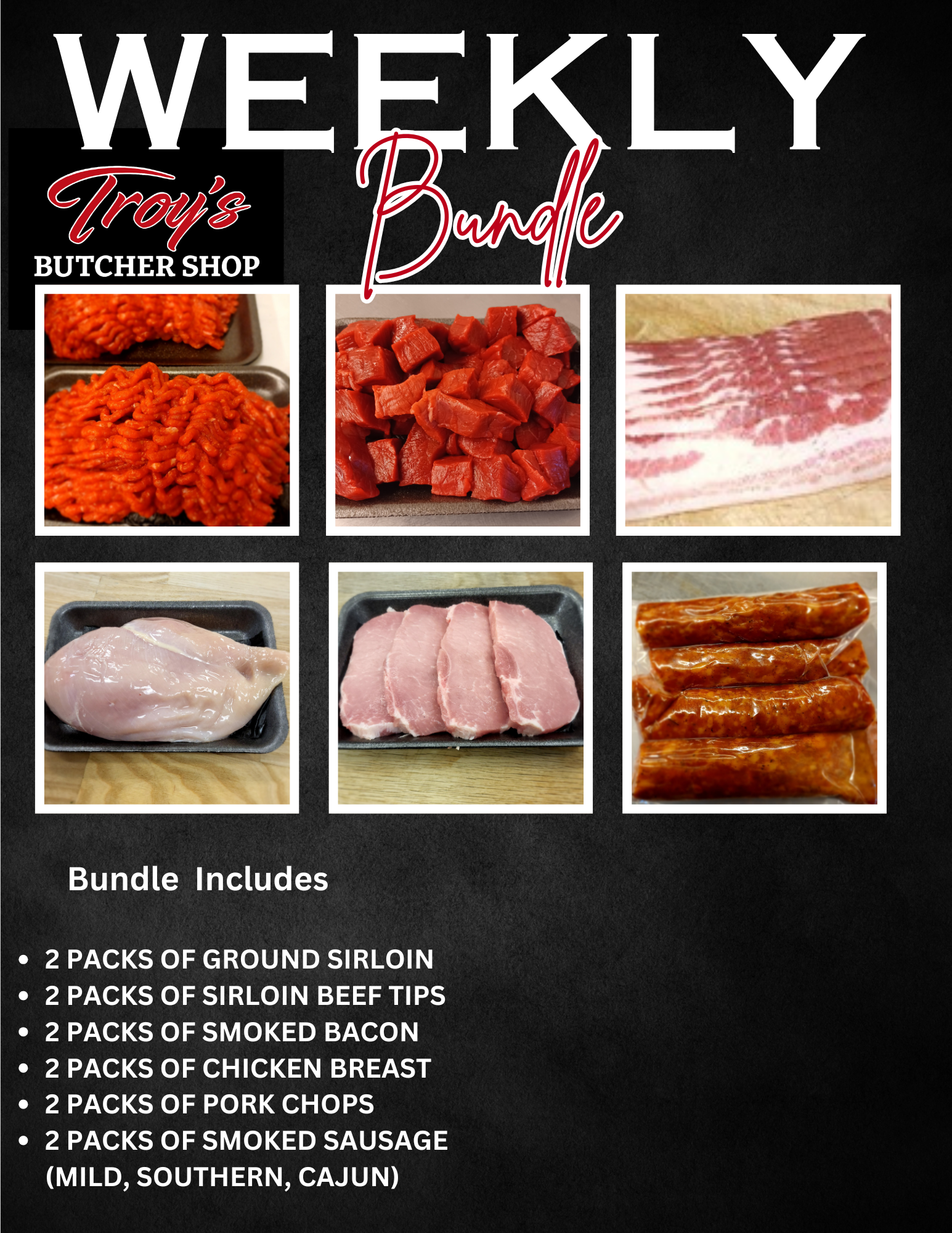 - 2 Packs Troy's Smoked Sausage (Mild, Southern, Cajun)